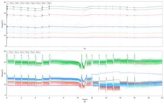 Figure 24a showcases the voltage waveforms, indicating that the PV module strings in the PV generation system, using equalization technology, as well as each PV module within the PV module string, operate at the maximum operating voltage and vary accordingly with changes in irradiance. Meanwhile, Figure 24b presents the voltage waveforms of each PV module based on the EPO algorithm, showing different degrees of fluctuations, with the magnitude of the fluctuations related to the maximum operating voltage of the PV modules and the changes in received irradiance. This suggests that the EPO-based algorithm is constantly regulating the operating voltage of each PV module in the PV generation system, particularly during sudden changes in irradiance, with a significantly increased magnitude of regulation.