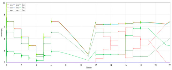 Figure 25 depicts the simulated waveforms of the output current, equalization current, and equalized current of each PV module in String1 of the mixed-connection PV generation system. The equalization effect mirrors that of Figure 19d, except for the equalization current iCE12, which is consistently zero, signifying the absence of equalization current on PV12, and the corresponding diode D15 on the equalization branch remains in the off-state. In contrast, the values of iCE11 and iCE13 change correspondingly with variations in irradiance.