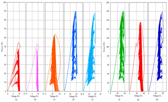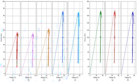 MPP trajectories of mixed-connection PV generation system based on proposed scheme: (a) PV11, (b) PV12, (c) PV13, (d) PV21, (e) PV22, (f) PV31, (g) PV String1, and (h) PV String2.