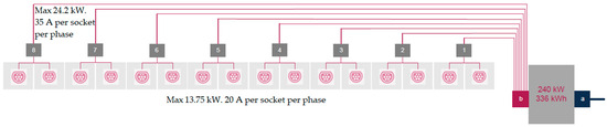 The main characteristics that define the BESS and CPs are presented in Figure 1 and Table 1. A 3 × 80 A grid connection is fed into the container housing the BESS, point a in Figure 1. The BESS is compiled from four battery stacks connected in parallel via four separate inverters, each fitted with a 100 A breaker. There is an air-conditioning unit within the BESS container to ensure a safe operating temperature is maintained. Leaving the container is the AC feeder line, point b in Figure 1, to which each of the eight dual-connector CPs are connected in parallel. Each dual-connection CP has had the phase connections rotated, as is standard [22]. In Case 2, single-phase EVs connect to the same CP, and phase rotation ensures they do not load the same phase. Each CP is fitted with a 35 A fuse per phase and each socket within the CP is fitted with a 20 A fuse per phase. This setup allows for the CPs to draw power from the grid, from the BESS, or a combination of the two. Similarly, the grid connection can feed power to both the CPs and the BESS given the available capacity. Conventional load sharing is applied when necessary [22]. The BESS is a commercially available system supplied by BECK [23]. The BESS uses lithium-ion technology, the common choice given its high cycle-life, high round-trip efficiency, and fast response time [24].