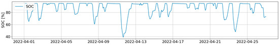 The battery is considered to be oversized for the current operation. In the 6 months of data used to build the model, the BESS dropped below 50% SOC 15 times and the battery is cycled too frequently for low energies, as depicted in Figure 2. Frequent and small discharge/charge cycles are detrimental to battery lifetime [25,26]. Additionally, the battery is being charged and discharged at very low powers, resulting in low conversion efficiencies and high energy losses. Considering that the grid connection capacity could still be increased further from the programmed 3 × 25 A up to the physical connection of 3 × 80 A, which remains a cheaper option than the annualised battery system costs, the battery energy storage capacity could be reduced.