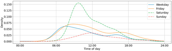 The entry events were separated by day since Friday, Saturday, and Sunday experienced different usage patterns than the working weekdays Monday–Thursday, as presented in Figure 3. This was to be expected, since, on Monday–Thursday, people generally follow similar work–life patterns. The peak connection time on weekdays is around 07:00–09:00, in line with commuter usage. There is also a second, smaller peak in the late afternoon from residents and evening visitors. It appears that a higher proportion of people arrive late on a Friday, to then park for the night or weekend. Saturday is a day in which people travel to the city for social/leisure purposes, whilst Sunday may still be regarded as a day of rest and, therefore, reduced P&R activity.