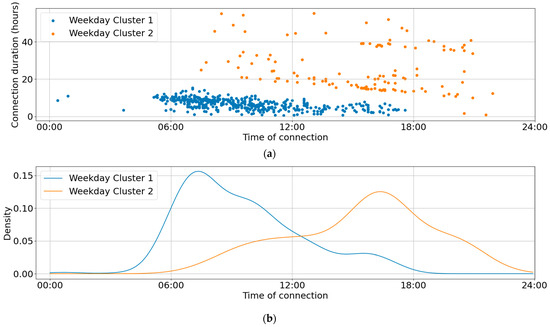 The charge sessions were then clustered into user groups using the Bayesian Gaussian Mixture Model (BGMM) from the Python scikit-learn library. When handling data with a distribution as visualised in Figure 4a, which plots the connection duration against the time of connection, a Gaussian Mixture Model (GMM) was found to be most suitable. BGMM performed better than a standard GMM due to the function’s ability to minimise the number of clusters, resulting in two clusters per day type. The time of connection and connection duration were determined to be the best indicators of conscious user behaviour and are more strongly correlated than other variables. Including more than these two variables did not yield improved clustering performance.