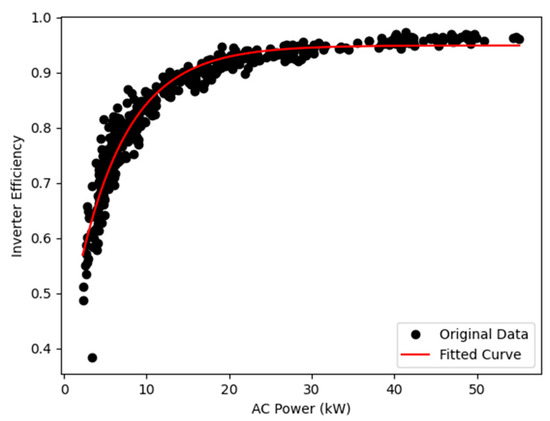 For battery charging and discharging, the inverter efficiency was sampled from the efficiency curve depicted in Figure 5. The curve was fitted to the filtered data using Equation (10), and initial values a = 0.95, b = −0.9, and c = 0.25.