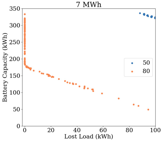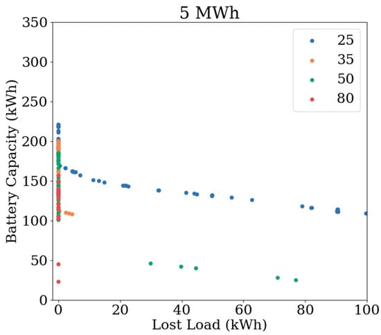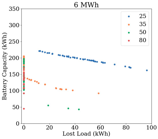 Figure 7, Figure 8 and Figure 9 plot the BESS capacities against the loss of load for the three load profiles of 5 MWh, 6 MWh, and 7 MWh. They were each compiled from four optimisation calculations amounting to 200 feasible solutions. There are many more feasible solutions not shown.