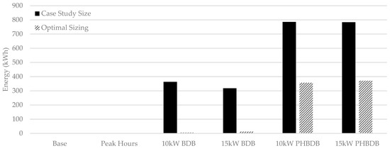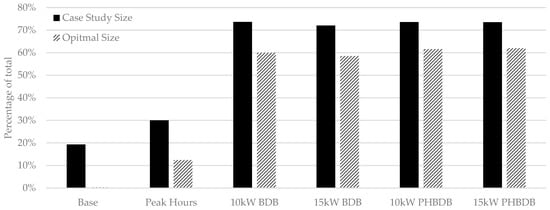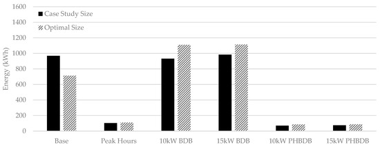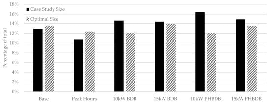 Figure 10 shows the loss of potential load. In every control strategy except the base case, the optimal sizing performed better than the case study sizing. All battery control strategies that imposed a battery charge/discharge deadband experienced a higher loss of potential load than the respective base case. This is because the battery, after supplying the full load for an extended period, will be drained, and, in some cases, the grid capacity is not enough to supply the full load.