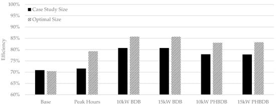 When using the optimal sizing, the battery system round-trip efficiency was increased for all control strategies with the exception of the base case, as depicted in Figure 11. The base case round-trip efficiency is lower with the optimal sizing because the battery would discharge at low powers; the maximum EV load was not much higher than the 55 kW grid connection. In fact, in some simulations, the battery would not be used at all.