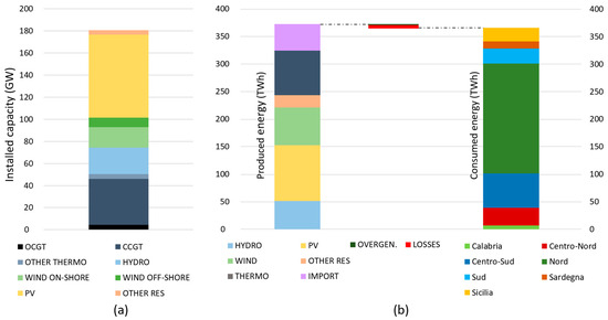 Reference scenario of installed capacity in GW (a) and yearly national energy balance in TWh (b) for Italian power system in 2030. Consumed energy equals produced energy, minus losses and overgeneration.