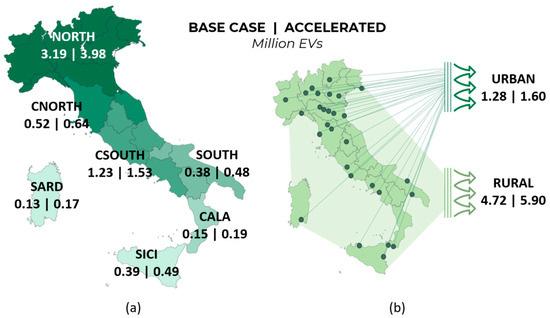 First, cars are by far the most abundant category of EV considered. The total number of cars considered is 6 million in the base-case scenario and 7.5 million in the accelerated one. The BEV share is 85% in the accelerated scenario, while it is 66% in the base case. Based on a previous analysis, it was possible to estimate the territorial diffusion of electric cars, forecasting their penetration at the municipality, province, and region levels based on a combination of four main parameters: the current number of circulating EVs, the per capita income, the air quality, and the availability of private garages. The local availability of garages was considered a major influence on EV diffusion, considering the importance of nighttime charging. Furthermore, appropriate weight was given to air quality, considering the diffusion of municipal restrictions on the circulation of polluting vehicles. Finally, the current diffusion of EVs and the average wage within a territory were considered positive factors promoting the adoption of EVs. As reported in Figure 2, this evaluation procedure allowed us to compute the numbers of electric cars circulating in two different spatial configurations: considering the seven Italian market bidding zones, and distinguishing urban and rural areas. In this latter classification, 44 urban areas were flagged as municipalities with more than 100,000 inhabitants, among which 59% were in the northern part of Italy.