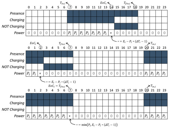 Indeed, the could be equal to the exit time () if the desired SoC () is only obtained while charging at full power for the whole stop duration () or is not obtained. Otherwise, the occurs between the entry and exit times. To account for the stops that last overnight, can be larger than . Similarly, can be larger than , indicating that charging ends the day after entry (this simplification only works in the assumption of a persistence model based on typical days). Following the procedure for each EV, Boolean arrays indicating the Presence, Charging, and NOT Charging periods are retrieved, as illustrated in Figure 4 for different situations. As can be seen, if the stop duration is longer than the time needed to reach , the Presence and Charging arrays are different. The difference between the Presence and Charging arrays defines the NOT Charging array. The Power array reports the charging power, which is generally equal to . Only during last charging hour is the power equal to the minimum between and the average power to reach at the end of the hour.