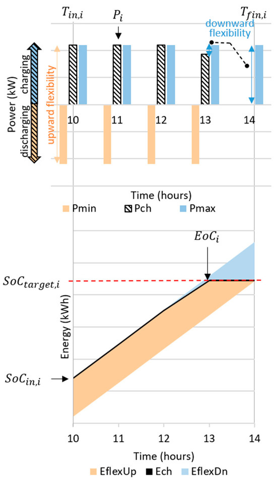 Once we have all the charging profiles, we estimate flexibility. Flexibility is obtained in this study assuming a no-harm approach: each car can provide flexibility if its stop duration is sufficient to reach from before the end of stopping (). This is the case for the top and mid charts of Figure 4. In that case, the EV can decrease the power input to zero to provide upward flexibility (V1G) or even discharge the battery to provide more flexibility (V2G). In any case, must be greater or equal to . Both the energy and power margin must be computed to assess flexibility. The approach can be better understood from Figure 5 with an example considering a car stopping from 10 AM to 2 PM and reaching before (we use load convention for the power sign). The charging power (Pi) is shown (top diagram) as well as the maximum power (Pmax) that can be withdrawn to offer downward flexibility, and the minimum power (Pmin) can be as low as 0 for V1G and negative (discharge) for V2G. The energy variation when charging (Ech) is presented (bottom diagram), as well as energy flexibility with the shaded areas: the downward flexibility (blue) considers charging at Pi even overpassing , while upward flexibility considers the minimum energy content in the battery (minimum SoC) for reaching the at .