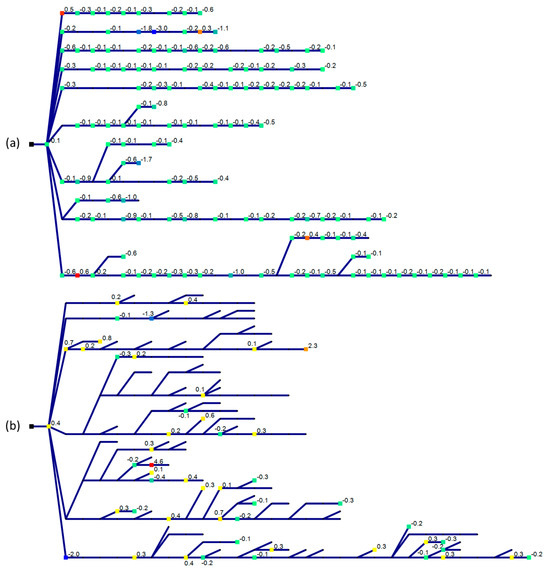 Schemes for the considered synthetic MV networks for urban (a) and rural (b) areas. The number and the color scale are coherent with the maximum exchanged power in MW (positive, yellow to red, for injection; negative, green to blue, for withdrawal) for the MV users (>0.1 MW of maximum exchanged power).