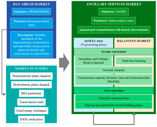 In the reference case, EVs behave as loads, where charging profiles are estimated as described in Section 3.1 and EVs are not able to provide flexibility since they do not participate in the ASM. In this study, the impact of EVs on power system dispatching was modeled thanks to MODIS (Market Operation and DISpatching), a multi-area market simulator developed by the CESI to simulate the Italian ASM [11]. Additionally, the DAM dispatching was simulated using CESI-owned market simulator PROMEDGRID [62], whose outputs are a day-ahead scheduled program of generating units, forecasted RES generation, zonal electricity demand, inter-zonal power exchanges, and market prices at the zonal level. MODIS acquires the results of the DAM simulation and performs an hourly dispatching optimization over a target year, while respecting the main operating and security constraints. These security constraints, including the necessary reserve margins, are imposed by the system operator (SO) network code and the relevant equations are considered. The tool reproduces the balancing actions on the diverse units along the market sessions of the Italian ASM, including the ex ante (ASM ex ante) and balancing market (BM) phases (see Figure 7).