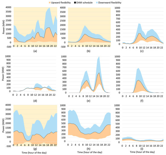 The flexibility profile in a market zone for a charging mode is obtained by summing the power and energy flexibilities for each EV with at least one element of the NOT charging array equal to 1 (see top and mid diagram in Figure 4). The result is yearly profiles with an hourly resolution (considering working and holidays, cold and warm seasons) summing up rural and metropolitan demand and flexibility for each of the nine charging modes and seven electricity market zones for Italy; these total 63 (=7 × 9) VPPs or aggregates of EVs bidding in the electricity markets. Charging profiles characterize the demand that EVs place on DAM. Flexibility power and energy profiles represent EVs’ capability of providing balancing services on the ASM.