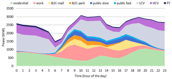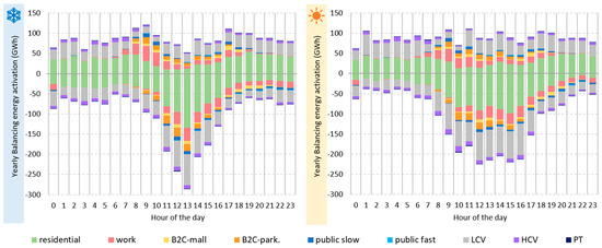 EV charging and flexibility profiles for each charging mode are shown in Figure 8 considering the overall Italian power system in a working day of the cold season. As can be seen, there are predominant charging modes, such as the residential and workplace-related ones. In addition, the weight of the LCVs is not negligible; in fact, this is considerable for both the power demand and the flexibility provided. For passenger cars, it is possible to highlight a correlation between the flexibility available and the average stop duration: residential, workplace, and B2C parking modes present an average stop of longer than 6 h and allow their charging power to be modulated down to zero. However, if the stop is shorter, there is less flexibility available. Fast public charging presents stops generally much shorter than 1 h, except for cases of a lunch or dinner stopover; because of this, flexibility can be provided only at mealtimes. Meanwhile, for heavier vehicles, higher charging powers and a wider availability of V2G increase the flexibility available for short stops.
