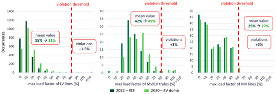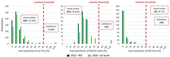 Table 12 summarizes the most important impacts of EV charging emerging from the simulation, distinguishing between DN and power system dispatches. Low-voltage lines suffer because of spatial and temporal clustering of EV charging episodes, which causes violations with a short duration but great intensity. Meanwhile, the overlapping of vehicles’ charging and the base load, especially in the evening, causes violations with a lower magnitude but a longer duration along medium-voltage lines. In general, urban DNs demonstrate problems mainly due to lines’ overloading, while rural networks present criticalities related to voltage fluctuations because of the asynchronous operations of PV plants (over-voltages) and the load (under-voltages), the latter comprising EV charging. Meanwhile, when we consider power system dispatching, the impacts of EV charging on the total energy demand and system peak load are negligible (4% and 5%, respectively). The main issue is the great uncertainty that EV charging introduces with respect to forecasting the power demand profile; however, while implying a need for greater power reserves, the resulting impact on dispatching costs is negligible.