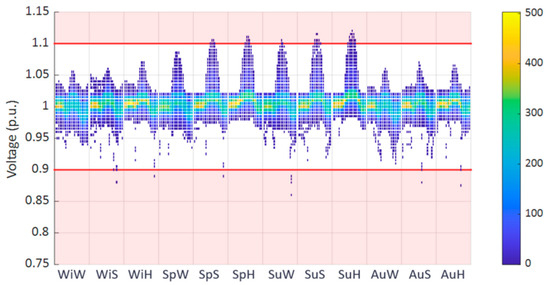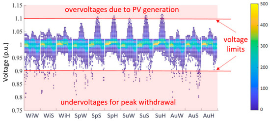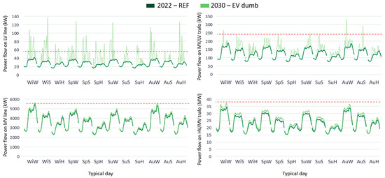 The outcomes of the procedure are the power and voltage profiles along the network components, simulated on twelve representative days, with hourly profiles. We exploited a dedicated power flow algorithm (Matpower (https://matpower.org/)) that allowed us to compute all the requested voltages and currents. The reference representative days include a winter’s working day (WiW), Saturday (WiS), and holiday (WiH); a spring working day (SpW), Saturday (SpS), and holiday (SpH); a summer’s working day (SuW), Saturday (SuS), and holiday (SuH); and an autumn working day (AuW), Saturday (AuS), and holiday (AuH). Finally, for the HV/MV transformers and MV lines, overloading is considered if the maximum current exceeds 60% of its nominal value; this also considers possible network reconfigurations. Instead, since usually there is no automation at the LV level, for MV/LV transformers and LV lines, the maximum current is set at 80% of its nominal values. The voltage limits for LV nodes are equal to ±10% of the nominal voltage.