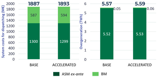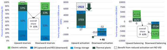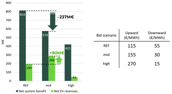 Finally, possible benefits of EV aggregates participating in the ASM are assessed with the same market modeling tools presented above. EVs are modeled as limited-energy-content units where charging profiles, as calculated in Section 3.1, are considered as DAM programs, while flexibility profiles (always calculated according to Section 3.1) are used to evaluate upward and downward available power. EVs’ scheduled programs and flexibility profiles consider the possible evolution of the EV state-of-charge during an ASM call for each charging event. Therefore, EVs are aggregated based on the market zone and the charging mode, thus obtaining 63 virtual power plants (VPPs) able to provide both power reserves and real-time balancing services. The bids presented by these EV aggregates are set at 115 EUR/MWh for upward regulation and 55 EUR/MWh for downward regulation, which are competitive and close to DAM prices [65]. The roundtrip efficiency of EV batteries is assumed to be 80%. A minimum service duration of one hour is considered for the requested regulating power provision; this is assumed for all storage technologies and for both FRR and RR. Moreover, the available FRR power band is limited to 15% of the total available flexibility band.