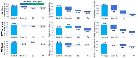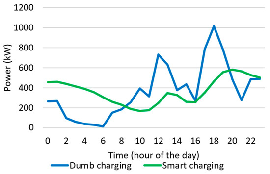 Consequently, three different VGI solutions are simulated to evaluate possible benefits of EV charging for DN power and voltage profiles. First, it is assumed that connected EVs can modulate their power withdrawal, distributing their energy absorption along their stop duration and thus implementing so-called smart charging techniques. Smart charging is implemented whenever possible on all charging modes but, in particular, in the workplace, B2C mall, B2C park, and residential parking. While in dumb charging, the maximum charging power is always assumed, when smart-charging solutions are implemented, the power absorbed is limited according to the EV user’s needs and network constraints, thus exploiting the flexibility margins available, as introduced in Section 3.1. The smart-charging techniques implemented include both V1G and, whenever possible, V2G solutions. A second solution considers the installation of a battery to support fast-charging stations. A BESS acts as a low-pass filter, reducing power peaks, especially when a lot of charging points are operating along the same feeders. BESSs are installed at charging stations with a maximum charging power of between 50 and 200 kW; their nominal power is equal to that of the station they are connected to, and their energy capacity ensures a maximum charging/discharging duration of one hour at the nominal power (energy-to-power ratio of 1 h). In detail, the adopted control strategy assumes that the BESS is fully charged (SoC of 100%) at the beginning of the simulated day; then, it discharges to keep the maximum power withdrawal from the grid below a specific threshold, which has been fixed at 30% of the EVSE nominal power. When the requested charging power returns below the specified threshold, the BESS starts charging in order to be fully charged by the end of the day. Finally, a third solution foresees the installation of photovoltaic (PV) plants near certain loads connected to the DN. A 3.3 kW PV generator is assigned to all the non-domestic charging stations: this is expected to increase possible synergies between daily EV charging and PV generation by lowering the distance between power production and consumption. The costs of BESS and PV systems are not considered since the objective of the analysis is to show only their technical benefit; otherwise, a more complex and comprehensive model should be used that integrates other services (e.g., arbitrage). It is important to note that implemented smart-charging solutions are not optimized. Specifically, installed PV generators and batteries are equally distributed over all charging points, allowing us to assess whether a non-optimal implementation of these solutions can improve network performances when there is a lack of coordination between CPOs and DSOs.