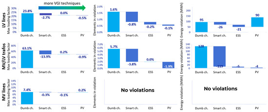When we consider distribution networks, VGI is linked to three main benefits. First, demand response actions applied to EV charging in DNs, and mainly driven by implicit price signals such as time-of-use (ToU) charging tariffs, allow for a 13% reduction on average in the DN load factor. The implementation of smart-charging procedures results in a general smoothing and flattening of the demand profile, which brings advantages for both the average load factor and the volume of energy during violations. The demand response is particularly important in two situations: in the evening (18:00–21:00), within clusters characterized by the residential load, and during the morning (8:00–11:00), when the penetration of commercial and business users is higher. In addition, the demand response (including both V1G and V2G) is fruitful, especially for long-duration charging, which allows for sufficient flexibility in the management of the charging power to reach the desired SoC. Second, BESSs are useful when coupled with fast charging, resulting in a substantial reduction in the overloading episodes (−30%). Since fast charging is characterized by short-duration stops, it is typically not possible to directly modulate the charging power; the use of a BESS allows for preventively storing part of the energy needed to charge the EV, thus reducing short but very high power peaks. This has a great benefit, especially for low-voltage lines. Moreover, the lower peak power required for fast charging allows charging infrastructures characterized by a high overall power (>100 kW) to connect to low-voltage networks. Finally, the possibility of coordinating EV charging with PV production implies a great benefit for the DN, reducing the energy exchanged during violations by up to 70%, thanks to a reduced frequency and intensity of violation events themselves. This contingency is particularly relevant for metropolitan networks, while the longer distances and smaller load density in rural areas make it less useful.