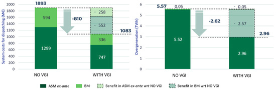 VGI benefits are hence estimated by comparing the reference power system dispatching scenario (dumb EV charging, NO VGI scenario) with a scenario where the EVs participate in the balancing market (VGI scenario). In particular, the following aspects are evaluated: ASM cost reduction, as the difference between ASM costs in the NO VGI and VGI scenarios; overgeneration reduction, quantified in terms of avoided NP-RES curtailment in the VGI scenario; EVs’ actual participation in power system balancing, assessed in terms of balancing energy volumes provided by EV aggregates and the power reserves procured by exploiting EVs’ flexibility; and environmental benefits, calculated considering the variation in pollutant emissions between the NO VGI and VGI scenarios.
