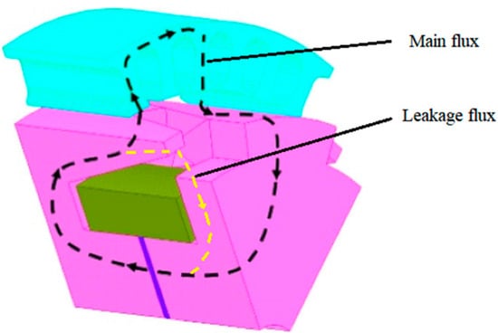 The total flux of a generator is divided into the main flux and the leakage flux. The main flux is the part of the flux that passes through the stator core and generates electricity, while the rest is the leakage flux [24]. The leakage flux does not pass the stator core but goes through the air gap between the claw poles. Since the permeability of ferromagnetic materials is much higher than that of air, most of the magnetic flux passes through the stator core. The magnetic circuit of a claw-pole series magnetic circuit HEG is divided into a permanent magnetic circuit and an electromagnetic circuit, and they share the same path [25]. The magnetic circuit of the generator is shown in Figure 2.