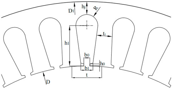 Because the alternating magnetic field exists in the stator when running, an alternating current is induced in the stator core, and thus, the core will become hot, which causes energy loss, reduces the sectional area of vortex flow pathways and increases the resistance. Making the core into a sheet and adding silicon can increase the resistance of the magnetic circuit; therefore, the stator core was made of 0.5 mm thick stacked D42 silicon steel sheets. After the calculations, the main parameters of the stator core are shown in Table 3, and the stator punching slot is shown in Figure 4.
