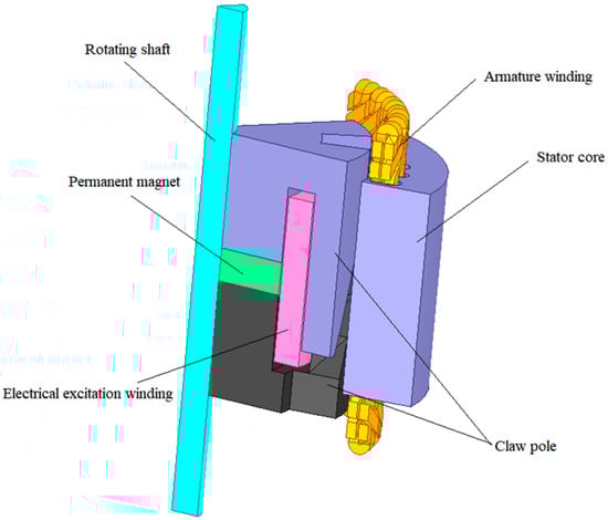 In summary, many scholars have conducted in-depth research on the mechanisms and principles of HEGs, which provides valuable references for their development [18,19,20,21]. On this basis, first, a novel kind of HEG with a claw-pole series magnetic circuit for a vehicle is proposed in this paper; the magnetic circuit was analyzed and the main parameters of the HEG were determined. Second, a three-dimensional finite element model was established, finite element analysis was conducted based on finite element theory and the structure and performance of the HEG were optimized according to the simulation results. Finally, a prototype was manufactured and tested to verify the rationality of the design’s topology and theoretical analysis. This research provides theoretical and practical support for the improvement of a vehicle generator.