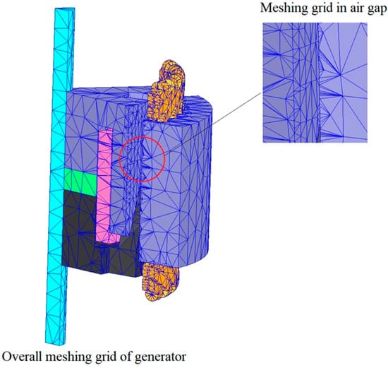 After the geometric model was established, a series of pretreatments were carried out. For the transient finite element simulation, the calculation accuracy was affected by the mesh generation. Different meshing precisions were set according to the generator model structure. In particular, the air gap section needed to be more finely divided. If the computer performance is excellent, the air gap can be divided into several layers, which will greatly improve the accuracy. However, if the degree of meshing is too fine, a lot of simulation time and computer resources are wasted to achieve only a small precision gain. If the degree of meshing is too sparse, the accuracy will be lower [34]. The meshes of the permanent magnets, windings, stator, rotor and air gap were different. The meshing results are shown in Figure 6.