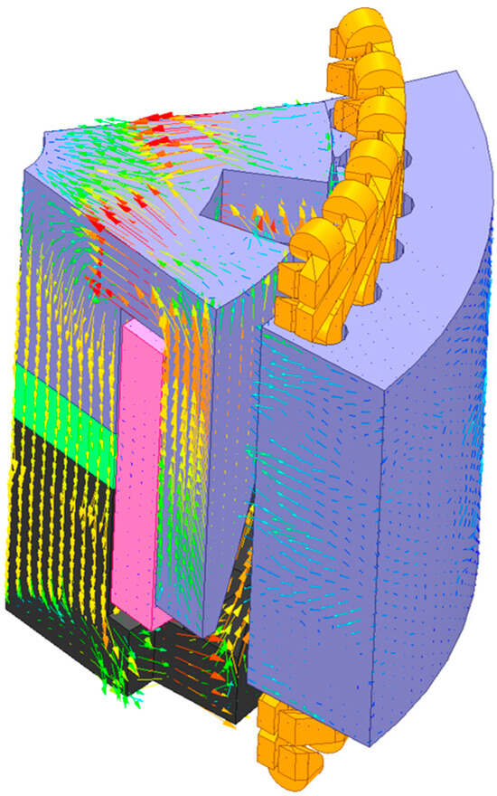 Magnetic density vector distribution. The red is excitation winding, the green is the permanent magnet, the black is the claw pole, the blue above the permanent magnet is the other side of the claw pole, the outer blue is the stator core, and the yellow is the armature winding.