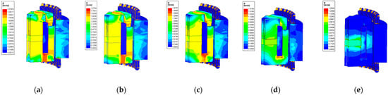Magnetic field distribution at different excitation currents: (a) magnetic field distribution when the value of the excitation current is 10 A; (b) magnetic field distribution when the value of the excitation current is 5 A; (c) magnetic field distribution when the value of the excitation current is 0 A; (d) magnetic field distribution when the value of the excitation current is −5 A; and (e) magnetic field distribution when the value of the excitation current is −10 A.