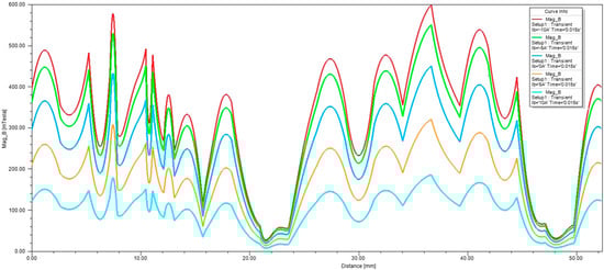 Figure 9 shows that the magnetic field density changed according to the current when the current increased from −10 A to 10 A; corresponding to the color of the model on the left side, the size of the magnetic field density decreased from Figure 9a to Figure 9e. The change in current influenced the magnetic field density significantly. From Figure 10, it can be observed that when the value of the excitation current was 10 A, the synthetic magnetic induction in the air gap was at the maximum, and when the value of the excitation current was −10 A, the synthetic magnetic induction in the air gap was at the minimum. The synthetic magnetic induction in the air gap could be effectively regulated by changing the excitation current. When the direction of the magnetic flux generated by the excitation winding was the same as the direction of the permanent magnetic flux, the synthetic magnetic induction in the air gap increased, providing magnetic enhancement, and vice versa. Therefore, through changing the value and direction of the excitation current, the synthetic magnetic induction in the air gap was changed, and, thus, the output voltage was controlled.