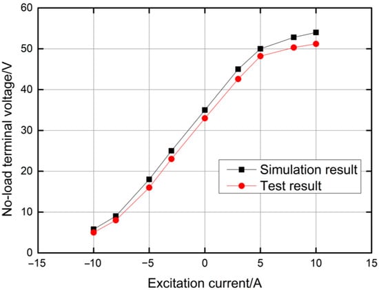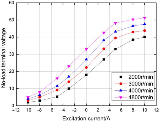 The relationship between the excitation current and no-load terminal voltage at different speeds is shown in Figure 18. Figure 18 shows that when the excitation current was −10 A, the no-load terminal voltage was low and very close for different speeds, which indicates that the electromagnetic magnetic field was opposite to the permanent magnetic field at this time; they mutually weakened and the effective synthetic magnetic field was weakened as well. From −5 A to 5 A, the no-load terminal voltage increased linearly with the increase in excitation current. When the excitation current exceeded 5 A, the increase tended to be slow, which indicates that the magnetic circuit tended to be saturated. The results show that the electromagnetic magnetic field could control the permanent magnetic field completely, which was consistent with the simulation results. For the same excitation current, the higher the speed, the higher the no-load terminal voltage. At the rated speed, the maximum no-load terminal voltage was 51.2 V and the minimum was 5.6 V when no voltage regulator was installed. When the excitation current changed, the no-load terminal voltage could change over a wide range, which indicates that the no-load terminal voltage could be effectively regulated by adjusting the excitation current.