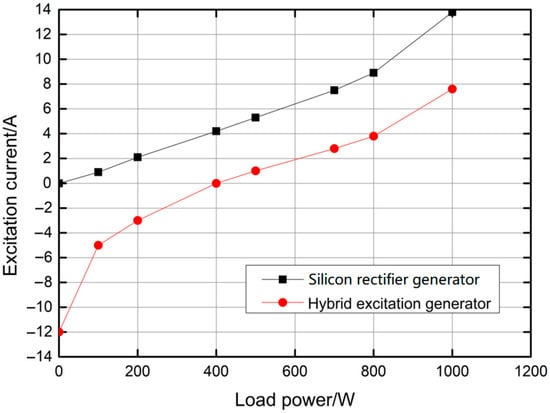 Figure 19 shows the excitation current required by an electric excitation generator and the HEG under different loads at the rated speed. When the load power was between 200 W and 800 W, the required excitation current increased linearly, which indicates that its voltage adjustment characteristics were excellent. When the load power was below 400 W, the required excitation current was negative and the electromagnetic field was opposite to the permanent magnetic field. The normal working power region of the HEG was generally above 400 W. In the normal working region, the overall excitation current of the HEG was only about 50% of that of the silicon rectifier generator. Therefore, the HEG could save 50% of energy under the same load condition. The excitation currents of the silicon rectifier generator and HEG were 13.8 A and 8.1 A, respectively, under the rated load. The excitation current can be further reduced by rationally designing the proportion of power occupied by the permanent magnet.