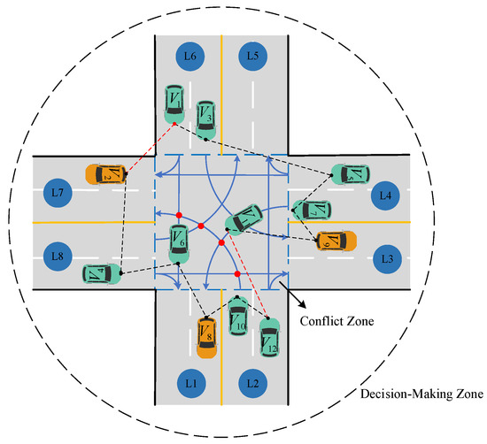 Once the vehicle reaches the decision area, a unique identification number is assigned to each vehicle. First, odd-numbered vehicles are sequentially linked in a virtual logical line, while even-numbered vehicles are processed similarly. Finally, the two virtual logic lines are interconnected end-to-end to create a closed virtual logic ring, as illustrated in Figure 1.