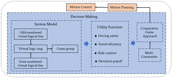 In the unsignalized intersection scenario shown in Figure 1, there is a conflict area and eight dual lanes labeled L1–L8 in a counterclockwise direction. These vehicles are equipped with autonomous decision-making capabilities, enabling them to make informed decisions and execute actions based on environmental cues and predetermined objectives once they have entered the decision-making zone, as illustrated by the green vehicles. Once the vehicle starts moving away from the conflict area, as indicated by the yellow vehicle, it is categorized as a moving-away vehicle. This type of vehicle maintains a safe distance from other vehicles until it exits the decision area. Every vehicle within the intersection region makes use of the V2X network to communicate with neighboring vehicles, share information regarding their operational statuses and perceived local road conditions, and follow the designated route, which is visually represented by the solid blue line. Nevertheless, during the interaction game among vehicles, various conflict points are evident, illustrated by the red dots, which may lead to instances of conflict and deadlock. Furthermore, with the rise in the number of vehicles, ensuring vehicle safety becomes increasingly challenging, leading to a notable decrease in intersection passing efficiency. To address the collaborative decision-making issue faced by CAVs at unsignalized intersections, this paper presents the development of a game theory decision-making framework, which is visually represented in Figure 2.