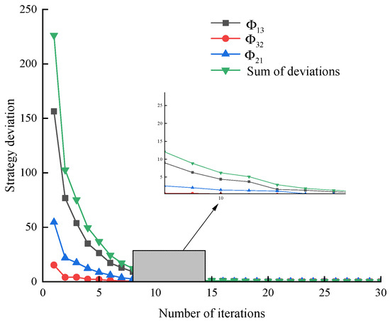 Figure 3 illustrates the variation in strategy deviation among three vehicles as the number of iterations increases. In the virtual logic ring, , , and are arranged clockwise, with policy deviations between the three cars denoted as , , and . As illustrated in Figure 2, initially, the strategy deviation values of the three vehicles are substantial, suggesting significant disparities in the cooperation proposals among the vehicles. Nevertheless, as the number of iterations increases, the policy deviation value gradually diminishes and eventually converges to zero. It is important to acknowledge that during the initial iteration, the policy bias may vary, as the optimal individual chosen by the genetic algorithm may not necessarily represent the global optimal solution. As the iteration progresses, the optimization algorithm incrementally discovers improved solutions, resulting in the stabilization of the strategy deviation.