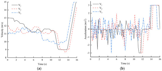 A graph illustrating the variations in vehicle speed and acceleration is presented in Figure 4. According to the data presented in the figure, it is evident that starting from 10.8 s, the speed of vehicle started to decrease gradually to safely navigate through the conflict area. At 11.8 s, vehicle entered the conflict zone. At 11.4 s, to avoid a collision with vehicle , vehicle initiated deceleration as it entered the conflict zone. Simultaneously, at the 12-s mark, vehicle also entered the area of conflict. In the conflict zone, vehicle traversed the area at a consistent speed and exited successfully after 13.6 s. Nevertheless, the decelerated within the conflict zone to enhance security measures and exited the area within 14 s. It is crucial to acknowledge that exits conflict point 2 before the entry of into the conflict zone. Hence, did not collide with . Unaffected by the collision, vehicle experienced a gradual acceleration at 13.6 s.