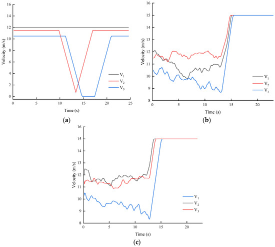 Vehicle speed under different decision algorithms: (a) Algorithm A; (b) Algorithm B; (c) Algorithm C.
