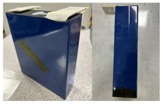 The experimental batteries utilized in this study were provided by Luoyang CALB (China Aviation Lithium Battery Co., Ltd., Luoyang, China). The batteries had dimensions of 173 mm × 54 mm × 207 mm and a rated capacity of 230 Ah. The charge and discharge cut-off voltages were set at 3.65 V and 2.5 V, respectively. The positive electrode material of the battery was lithium iron phosphate, while the negative electrode material was graphite. Details regarding the experimental battery samples and certain parameters can be found in Figure 1 and Table 1, respectively. Prior to the experiment, the sample batteries were charged at a constant current of 1 C to 3.65 V, followed by constant voltage charging at 3.65 V with a current of 0.05 C until reaching 100% state of charge (SOC). After completing the charging process, the experimental batteries were left to stabilize indoors for 24 h prior to conducting the TR experiments.
