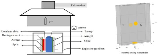 The experiments in this study were conducted within a safety laboratory. The experimental setup is illustrated in Figure 2. Thin-film thermocouples were utilized to measure the temperature during the experiment. Three temperature measurement points, labeled T1, T2, and T3, were positioned at the central regions of the front, back, and bottom surfaces of the battery, respectively. These thermocouples were employed to monitor and record the temperature variations occurring on the surface of the battery throughout the course of the experiment.