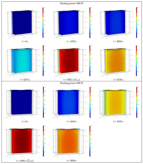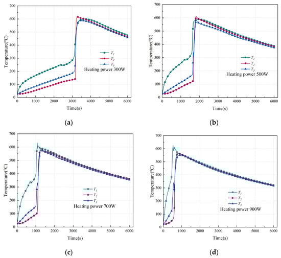 Figure 3. Variations of battery surface temperature under different heating powers. (a) Heating power 300 W; (b) heating power 500 W; (c) heating power700 W; (d) heating power 900 W.