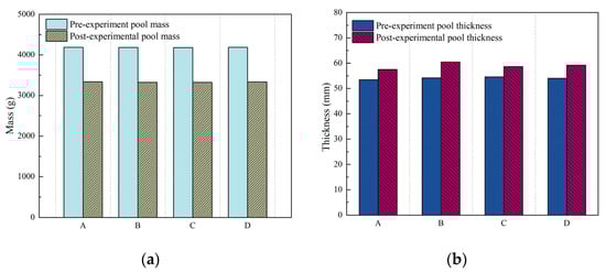 Figure 5. Changes in battery mass and thickness before and after thermal runaway. (a) Variation in battery mass; (b) variation in battery thickness. A: Heating power 300 W; B: heating power 500 W; C: heating power 700 W; D: heating power 900 W.