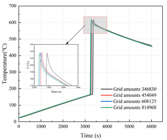 The accuracy of the simulation results in this study is closely related to the quality of the grid used. A higher grid accuracy leads to more accurate simulation results. For the TR model of lithium iron phosphate batteries, a tetrahedral mesh was employed overall, with local refinement in areas such as the cell, aluminum sheet, and heating element. In this study, four different grid densities were selected to compare the output results for battery back surface (T2) temperature triggered by a heating power of 300 W in order to determine the optimal number of grid divisions. The results, as shown in Figure 8, indicate that when the grid amounts are 368,274, there are slight differences compared to the results obtained with other grid quantities, while the differences in output results among the remaining three grid quantities are minimal. Considering the solution speed and computer memory usage, the optimal grid quantity was determined to be 454,049.