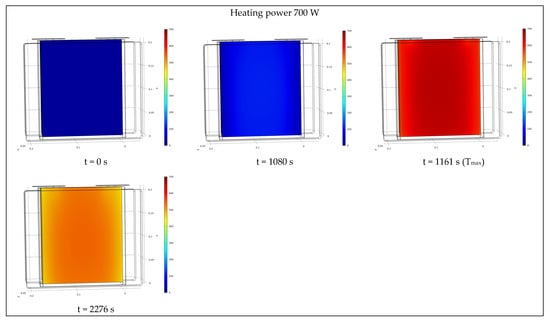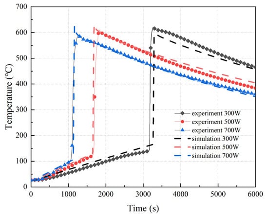 The results of the simulation and experiment are compared and analyzed, as shown in Figure 9. The trend of simulation results matches well with that of the experiments. Initially, the temperature gradually increases until it reaches a certain threshold, at which point the diaphragm ruptures, triggering a rapid and intense reaction that releases significant heat. Consequently, the surface temperature of the battery rises sharply, reaches its peak, and then gradually decreases, as shown in Figure 10. There is some deviation between the simulation results and the experimental data, which could be attributed to the selection of certain parameters in the simulation process based on literature from the same battery type system, leading to slight discrepancies from the actual battery parameters. Additionally, environmental factors such as temperature and humidity during the experimental process may also contribute to differences between the measured and simulated results. However, the temperature trends in the simulation results are similar to those in the experimental results, with an average error within 5%, indicating good agreement. The established TR model can effectively reflect the temperature characteristics of lithium iron phosphate batteries during the TR process.