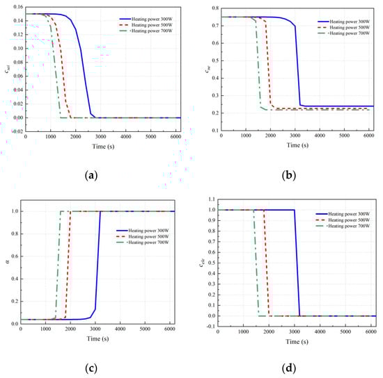 As the heating power increases, the decomposition rate of the SEI decomposition accelerates, corresponding to an increased rate of change in c s e i . Compared to 300 W heating power, at 700 W heating power, the decomposition time of the SEI decomposition is advanced by approximately 830 s. The slopes of the α and c e l e curves further increase, indicating a continuous acceleration in the reaction rates of the positive electrode and electrolyte. With the deepening of the reaction degree, the final steady-state value that c n e can reach gradually decreases.