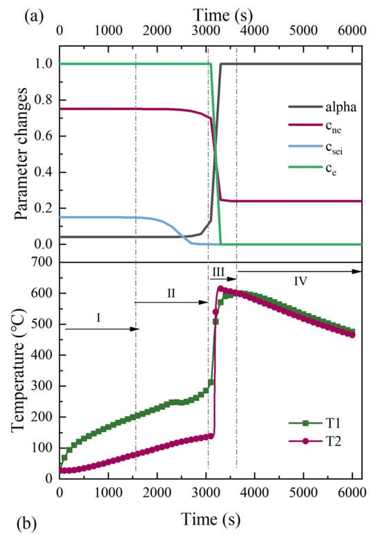 Upon applying a heating power of 300 W, the temperature of the battery exhibits a relatively slow rise during the initial stage (Stage I), as illustrated in Figure 12. Approximately at 1605 s, there is a gradual change in c s e i (Stage II), indicating the progressive decomposition of the SEI. Once the SEI decomposition reaches a certain extent, the lithium embedded in the negative electrode loses the protection of the SEI and starts to undergo decomposition reactions with the electrolyte, resulting in a significant decrease in c n e , signifying the onset of an intense exothermic reaction stage (Stage III). Around 3390 s, reactions occur between the positive electrode and the electrolyte, leading to rapid changes in α. Subsequently, the electrolyte begins to undergo decomposition reactions. During the time period from 3390 s to 3470 s, c n e ,  α , and c e l e undergo rapid changes, indicating intense internal reactions in the battery. As the reactants are gradually consumed and the reactions reach a certain degree, the changes in the composition of various substances tend to stabilize (Stage IV).