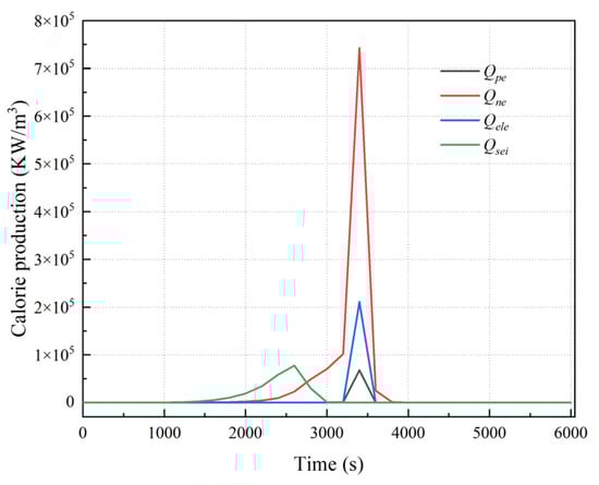 Figure 13 and Figure 14 show the magnitude of heat production and the percentage of heat production of each side reaction inside the battery under the heating power of 300 W. Prior to the TR event in the battery, the SEI decomposition generates heat, which reaches the peak value of 77,865 KW/m3 at 2590 s. Starting at 2300 s, the negative electrode–electrolyte reaction begins, initially exhibiting a low rate of heat production. However, after 3200 s, the heat production rate of the negative electrode–electrolyte reaction sharply increases. Concurrently, the positive electrode–electrolyte reaction and the decomposition reaction of the electrolyte itself occur, resulting in the release of a substantial amount of heat. These internal exothermic reactions intensify within the battery, causing the instantaneous conversion of electrical energy into internal energy. As a result, heat production rapidly escalates. Eventually, as the reactants are completely consumed, the heat production stabilizes.
