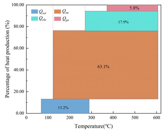 The SEI decomposition reaction, negative electrode–electrolyte reaction, positive electrode–electrolyte reaction, and electrolyte decomposition reaction contribute 13.2%, 63.1%, 5.8%, and 17.9% to the total heat production, respectively. Among them, the negative electrode–electrolyte reaction accounts for the largest proportion of heat production, making it the primary source of heat throughout the entire process. This reaction is also responsible for the significant temperature change observed during the TR process of the battery.
