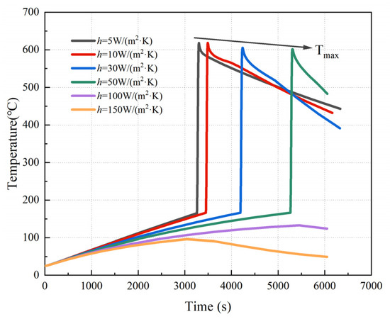 During the TR process of the battery, heat generated from internal chemical reactions is transferred to the battery surface. The battery surface then exchanges heat with the surrounding environment through convective heat transfer. In order to investigate the influence of the heat transfer coefficient on battery TR, simulations were conducted to analyze the temperature variation on the battery under a heating power of 300 W. The heat transfer coefficients considered in the simulations were 5 W/(m2·K), 10 W/(m2·K), 30 W/(m2·K), 50 W/(m2·K), 100 W/(m2·K), and 150 W/(m2·K).